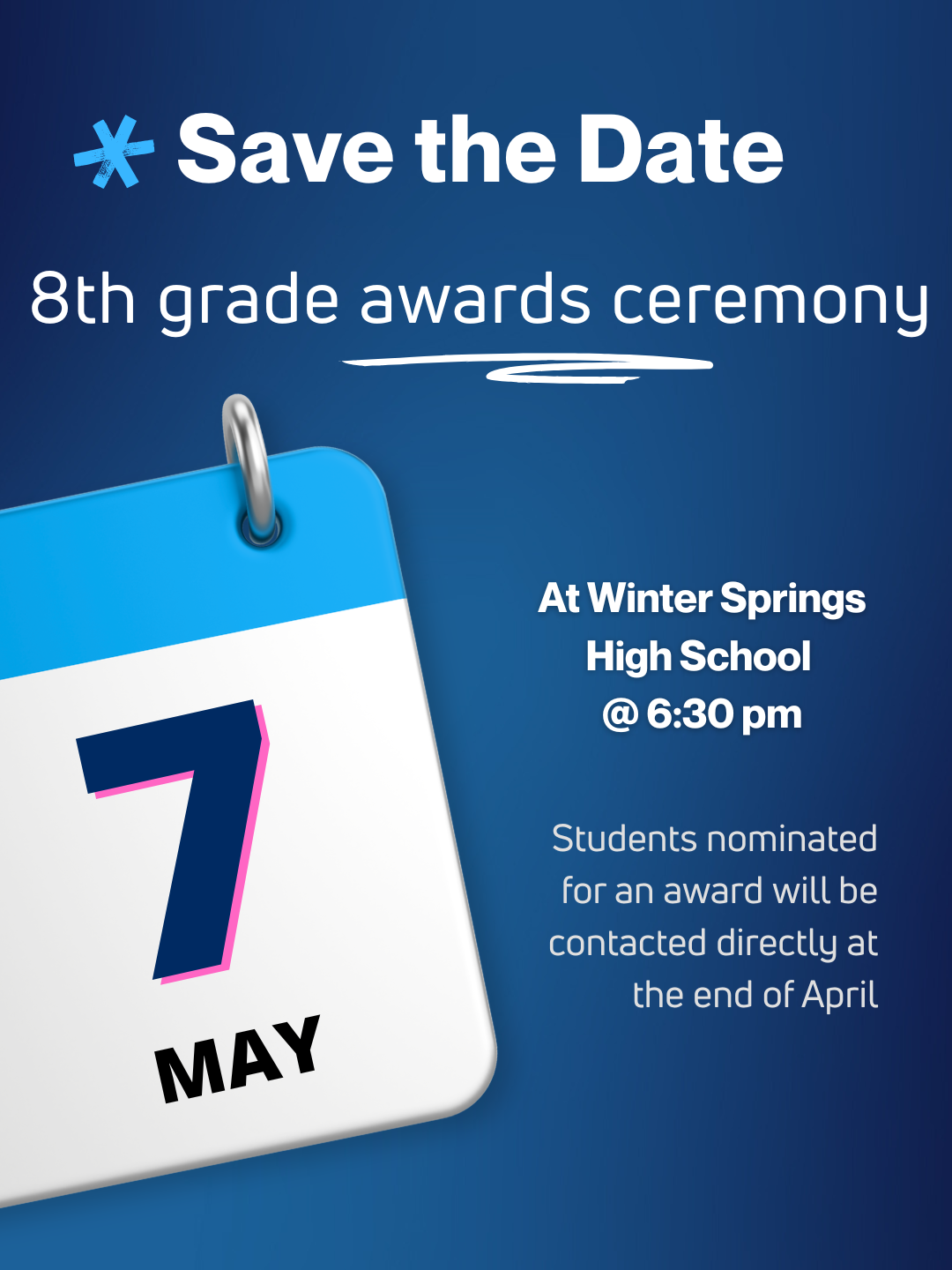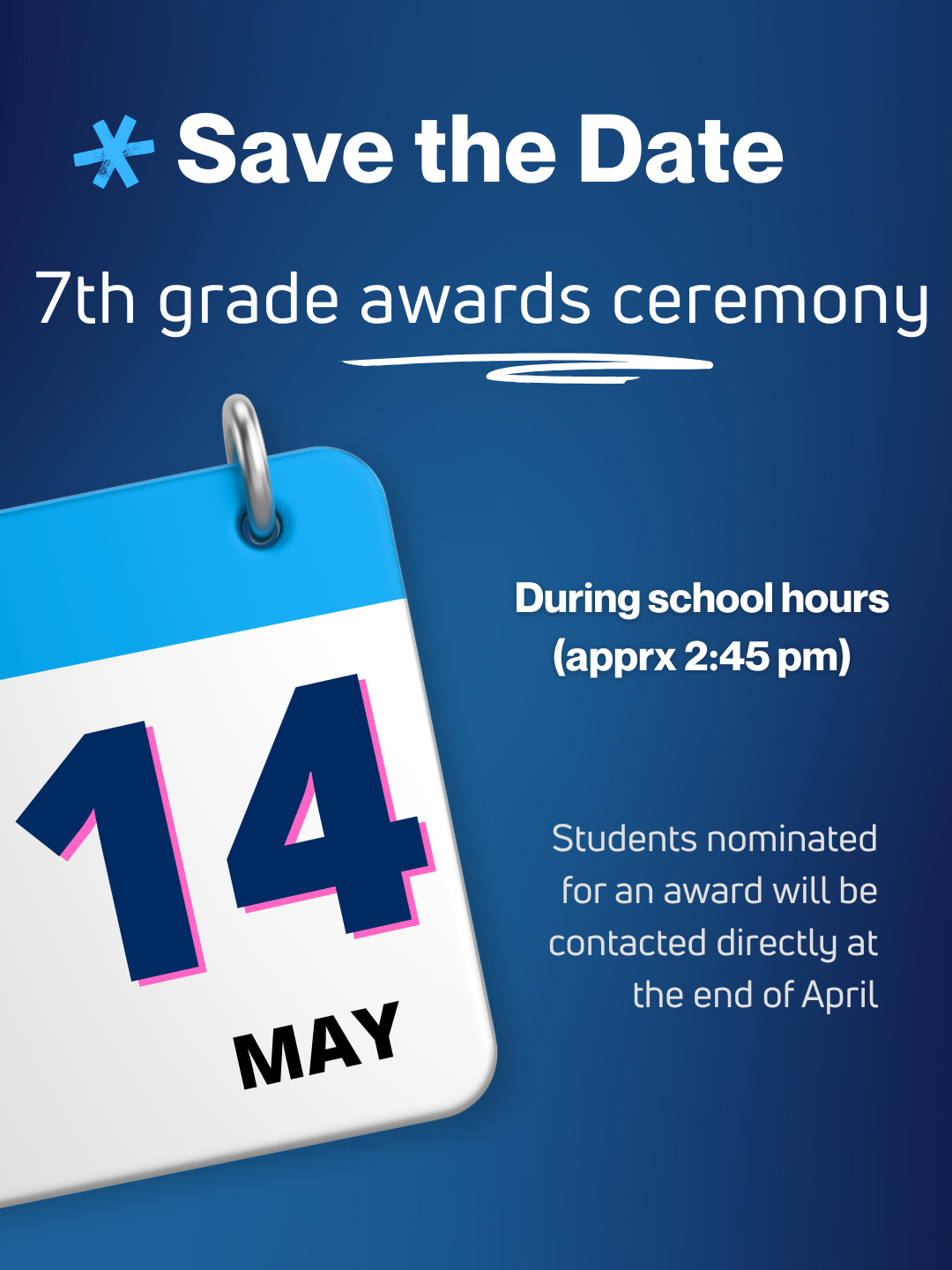Save the date! End of the Year Award Ceremonies are on May 7th for 8th grade students and May 14th for 6th and 7th grade students.